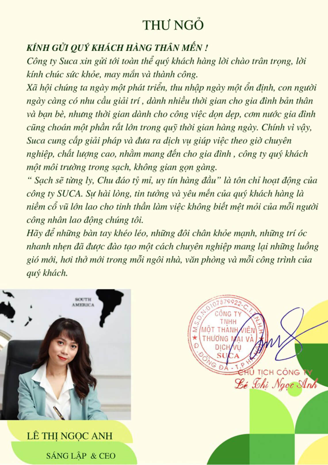 Với 10 năm kinh nghiệm làm về ngành quản lý nhân sự cho nước ngoài, học hỏi được rất nhiều từ các nước bạn. Công ty SuCa đã ra đời,với mục địch mang lại cuộc sống chất lượng hơn cho mọi gia đình .