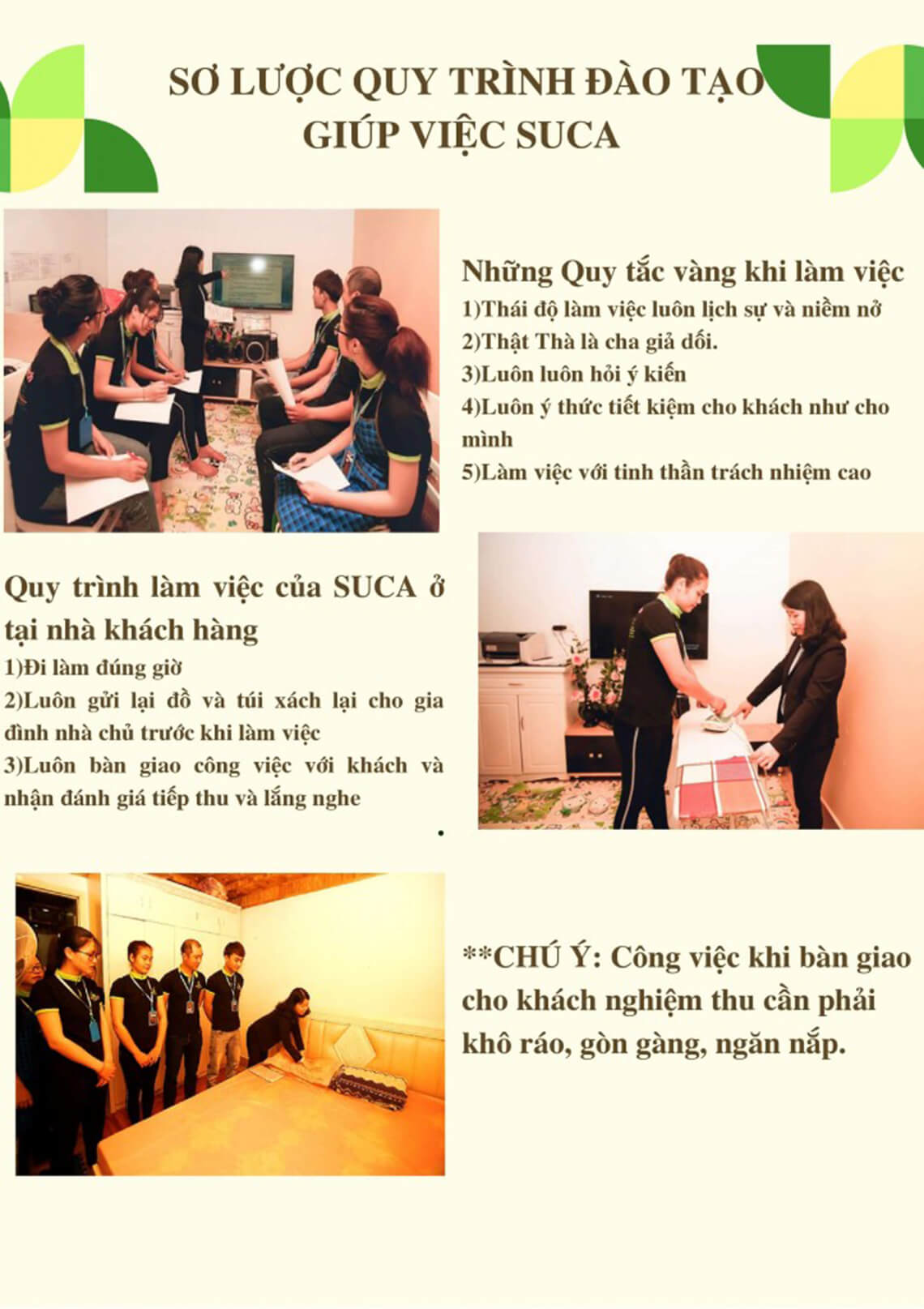 Họ được đào tạo không chỉ kỹ năng vệ sinh mà còn về kỹ năng dọn dẹp, nấu nướng, trông trẻ và phương thức giao tiếp với khách hàng. Làm sao để khách hàng cảm thấy tin tưởng và giao phó nhiệm vụ của chính gia đình họ cho Suca.